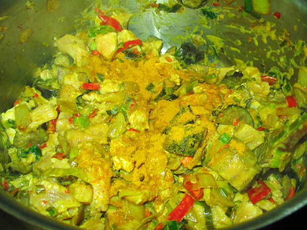 Agregue los condimentos y revolver mientras se cocina el pollo. Esta debe ir rápidamente si has picado en trozos suficientemente pequeños. Cuando el pollo esté hecho, probar y ajustar los condimentos al gusto. Claramente se debe degustar caliente, amargo, dulce y salado en el curry. Perforando el sabor con un poco más de los ingredientes frescos al final puede ser muy buena.