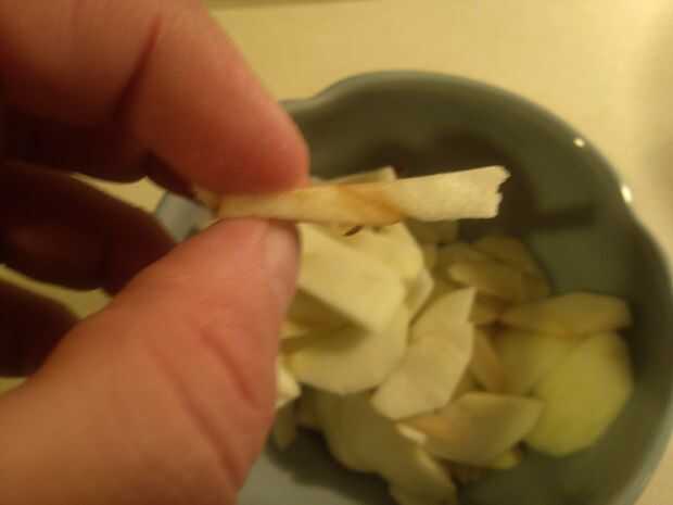 1 º pelar las manzanas y luego la base les. Una vez hecho esto, necesita cortarlas muy finas. Ver la imagen (pobre) a continuación para una idea aproximada. Estos están siendo relleno dentro una pechuga de pollo, lo pequeño es buenos.