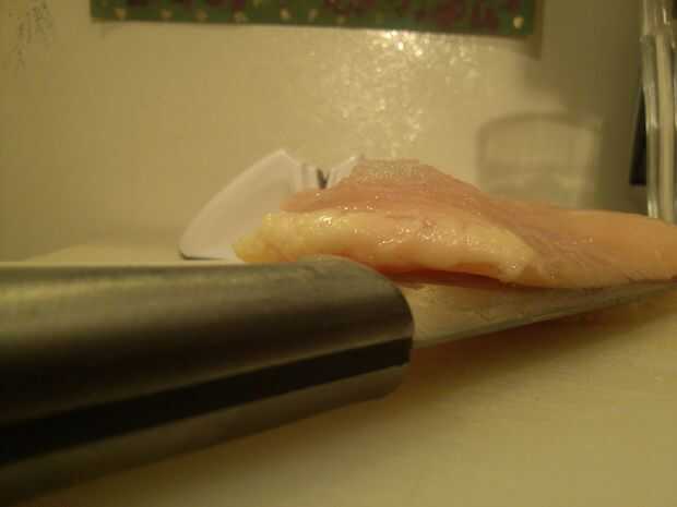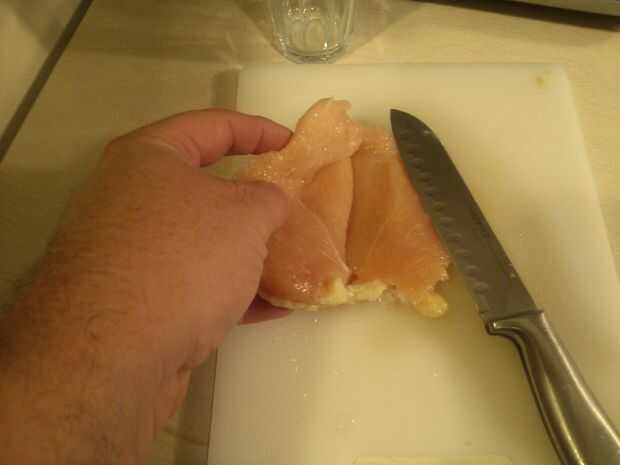 mariposa 3, el pollo. Este fue el paso que tuve problemas con. Traté de incluir una imagen, pero no creo que ayude. Básicamente, usted necesita comprimir la mama con la mano y luego cortar a la mitad. Si tiene derecho, debe parecerse el otro cuadro.