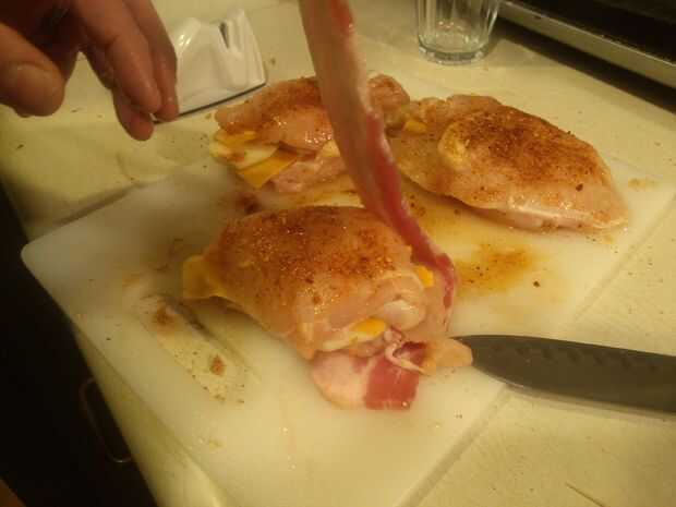 Una vez el pollo sazonado y rellenos, su tiempo para envolver! Normalmente utilizo 2 rebanadas de tocino por mama. Dependiendo de cómo lo hace, puede iniciar la envoltura en tapa y palillo de dientes en o inicio en la parte inferior.