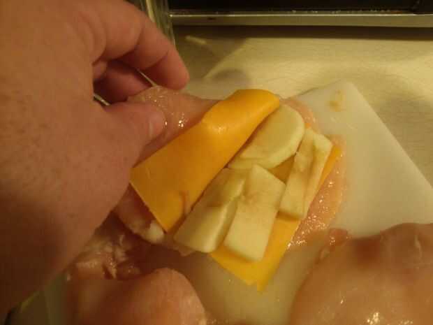 Tomar el queso y las manzanas y colocar sobre el centro del pecho abierto. Volver a plegar el pollo. Algunas personas pueden ser más cómodo toothpicking los pechos cerrados, pero recuerdan. Cada palillo que pones en él ahora, usted tiene que tirar más adelante cuando no será tan fácil,