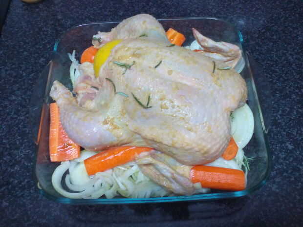 Paso 1: Elegir un pollo entero Preparar el pollo... Pongo un diente si ajo, media cebolla y apio dentro el pollo. También hice un masaje de Romero y mostaza marrón y termino el condimento con jugo de limón gran, luego usted puede lanzar en el limón c
