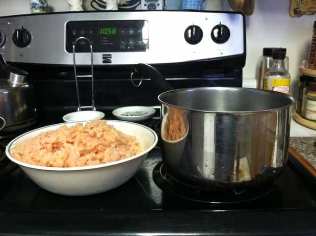 Poner agua en el recipiente a llenar para aproximadamente una pulgada por debajo del nivel del suelo de pollo (ver imagen)