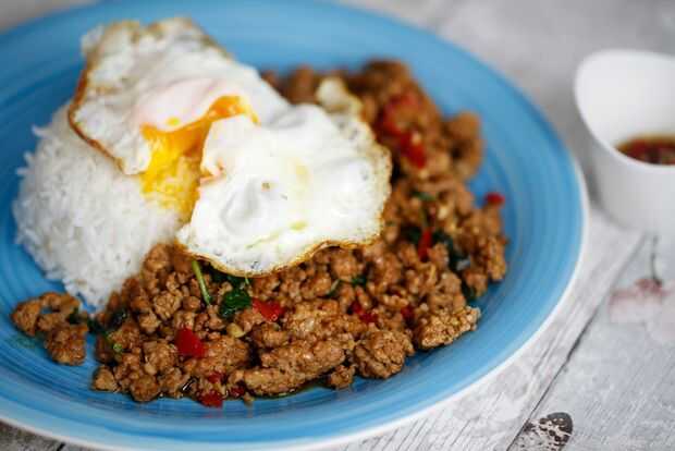 Pollo albahaca tailandesa (PAD GAI de KRAPOW) es uno de los alimentos más populares de la calle tailandés. Este plato es rápido, fácil, y macro ambiente. También es una opción de gran mealprep Aunque tradicionalmente este plato se sirve como una sola