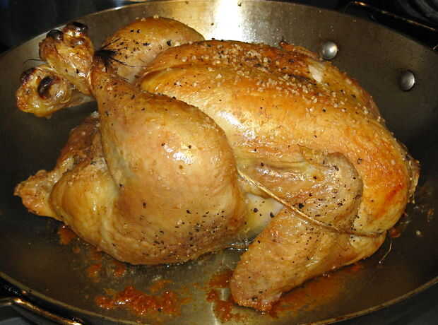 Inmediatamente después de retirar el pollo, Hilvanar la parte superior con bandeja de goteo. Si tienes hierbas frescas para agregar (tomillo, orégano, etc.) agrega a los goteos de la cacerola y dejarlos empinado por un momento antes de bañar. Cortar la cuerda alrededor de las piernas de pollo y desenvolver con cuidado el resto del cuerpo. (se desprenderá fácilmente.)