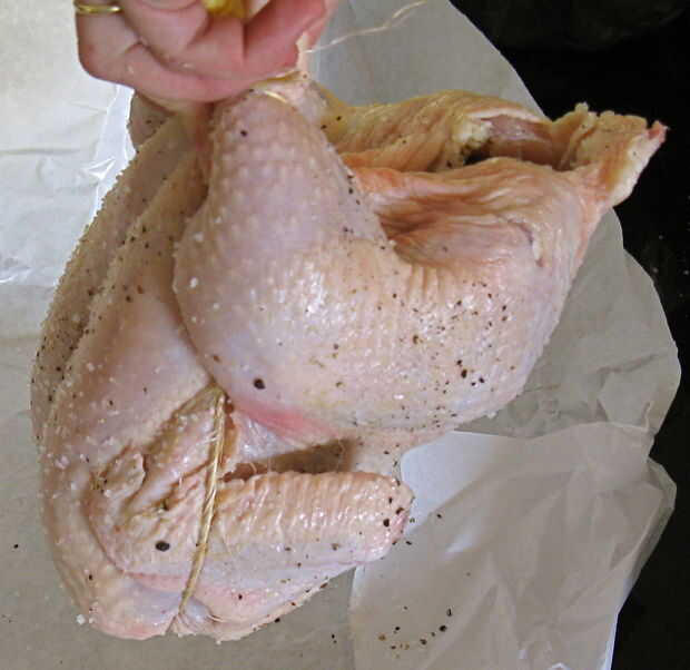 atar un pollo (o cualquier otra Ave) asegura que las patas y las alas se sujetan firmemente contra el cuerpo. Esto ayuda a la gallina mantiene su forma y cocine uniformemente sin deshidratación de las extremidades.Esta forma básica de celosías es mue