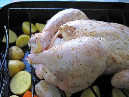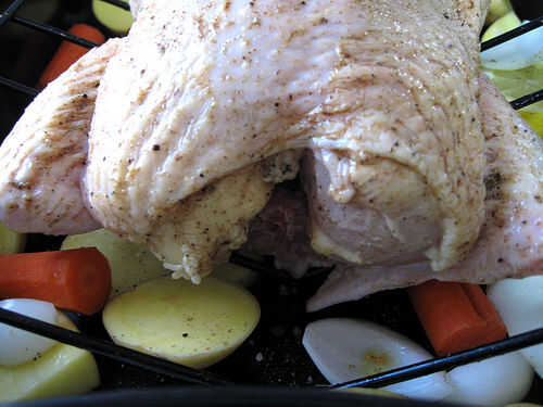 A continuación, vierta un poco de oliva aceite en tu mano (o conseguir un poco de mantequilla) y frotar todo el pollo. Entrar en todos los rincones y grietas - le dan el mejor masaje que nunca ha tenido!