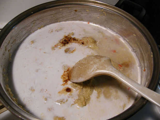 Verter en la leche de coco, 2 cucharadas salsa de soja dulce y Vegeta/aderezo, revuelva para combinar