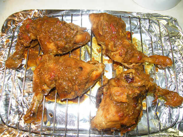 Coloque el pollo en la hoja con una parrilla en él y pincel con la salsa de la hornada