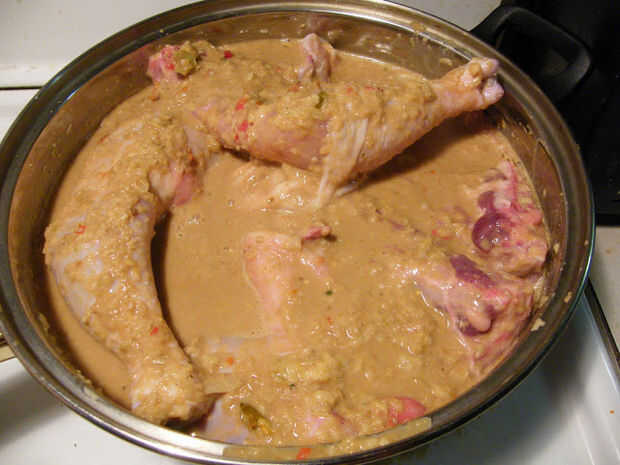 Añadir el pollo y cocine a fuego medio hasta que espese la leche de coco y pollo es cocinado a través de