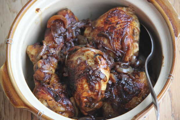 Añadir la rebanada cebolla, rojo vino y vinagre (o vermut) y cocine a fuego pequeño hasta que el pollo esté cocinado.