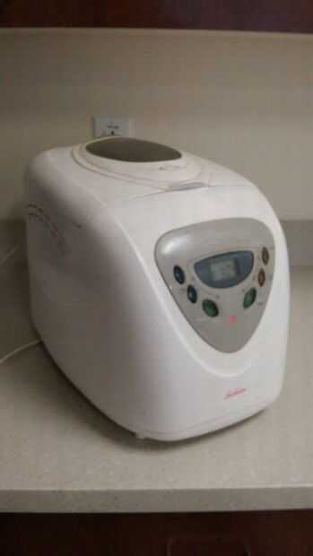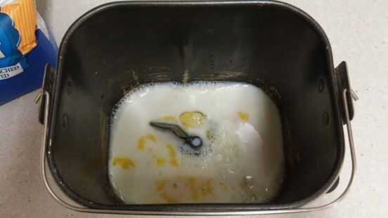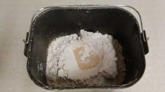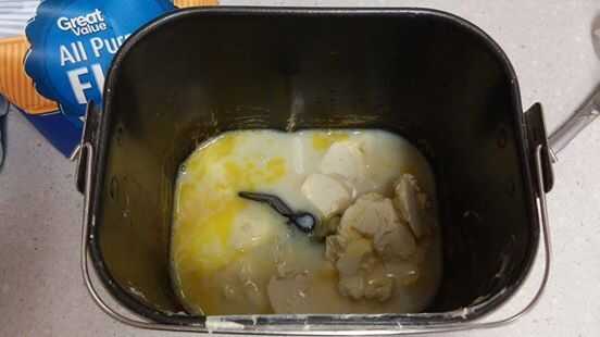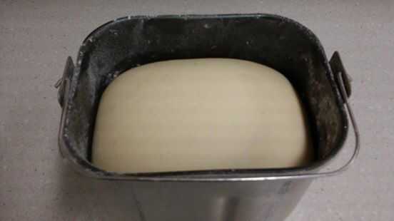 Añadir todos los ingredientes para máquina de pan. Inicio ciclo de amasar y añadir más harina según sea necesario. Terminé usando aproximadamente 4 tazas de harina total. La masa debe moverse libremente en la máquina de pan sin pegarse a los lados de la bandeja de pan. Deje que la masa al pasar por el ciclo de amasado de la máquina de pan.
