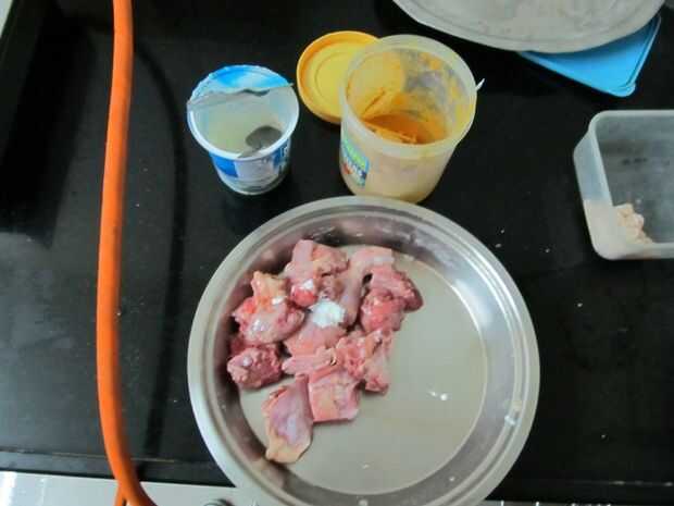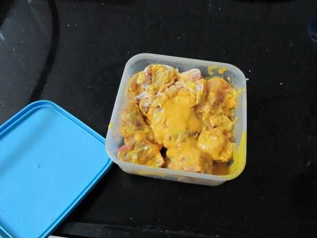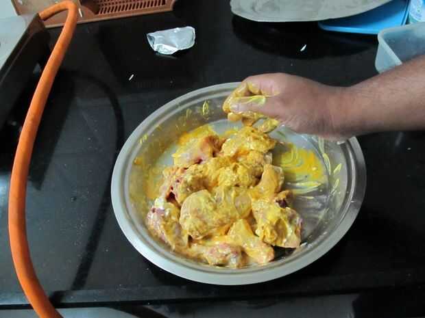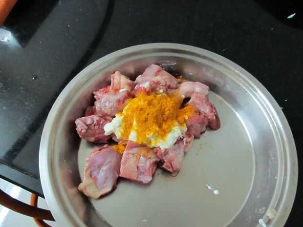 Añadir 1 té cuchara sal, 1 cucharadita de cúrcuma, 4 cucharada de cuajada y mezclar correctamente. Trate de mezclar con la mano para obtener la especia distribuida uniformemente.