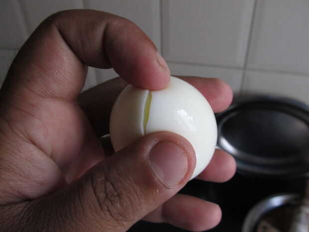 Hacer pequeñas inserciones en los extremos de los huevos. Esto es importante para freír los huevos, o bien va a explotar (se puede confía en mí en eso)
