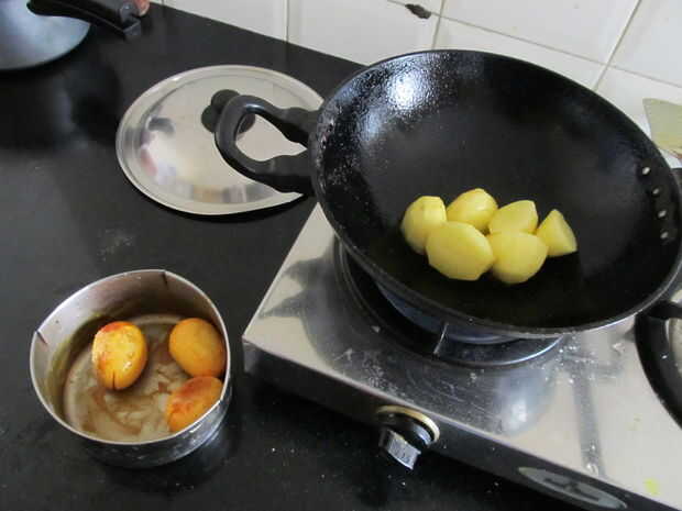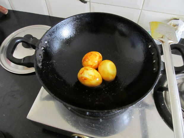 Freír los huevos con la cúrcuma y la sal hasta que hay una corteza formada. Puso a un lado.