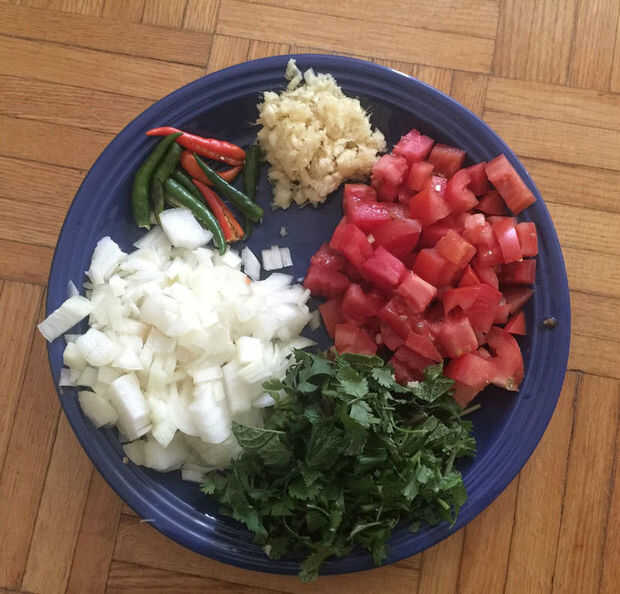 1 taza hojas de cilantro y menta, picadas + algunos para guarnición