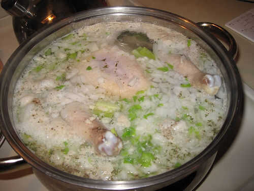 Pollo y bolas de masa hervida: Se reúnen los ingredientes antes de que nos reunimos a la familia!1 pollo entero (3 libras, más o menos cortada. Me gusta utilizar 2 a 3 lbs de piernas o cuartos).4 tazas - caldo de pollo (tal vez opcional)1/2 cucharadi