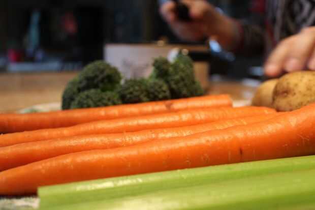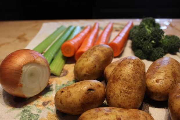 ** Limpiar todas las verduras y quitar las pieles de las zanahorias, patatas y cebolla.