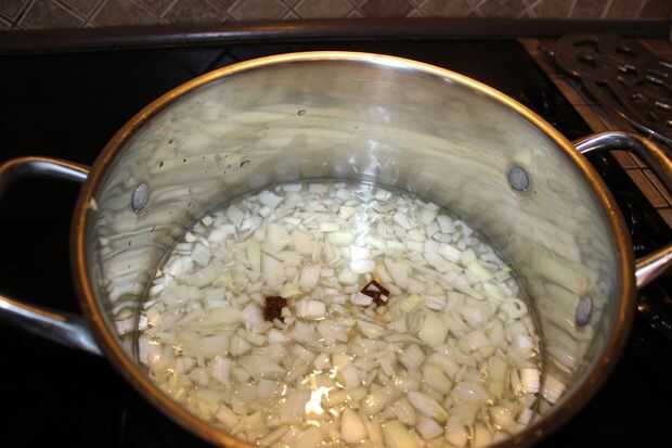 Lugar picado cebolla en una olla con 6 tazas de agua y 2 cubos de caldo de pollo. Gire la estufa en alta.