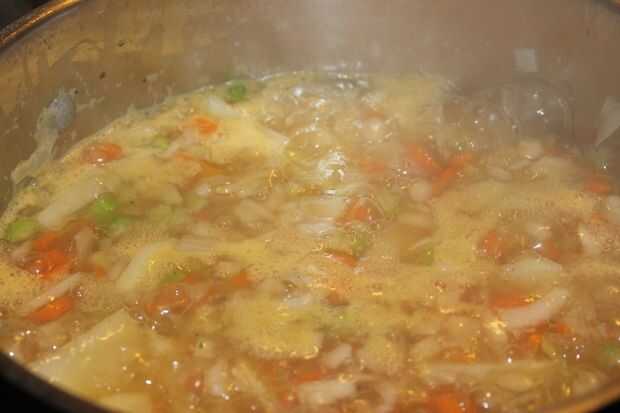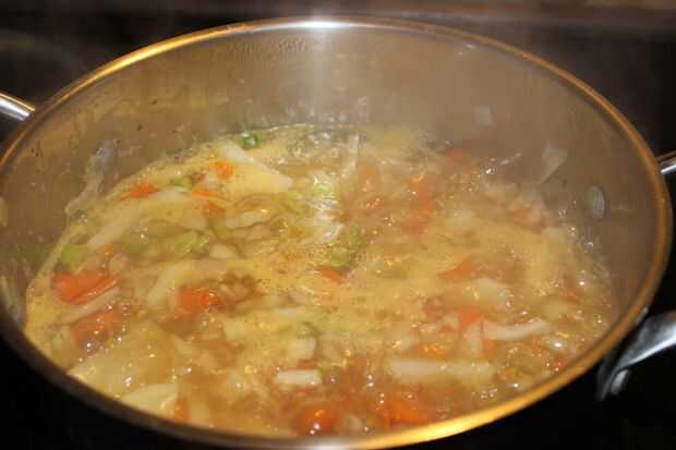 Siguiente, lugar de apio, zanahorias y patatas en sartén, poner a hervir.