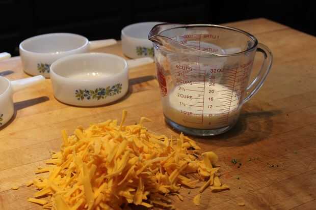 Mientras el pollo se cocina, destruir un bloque de queso cheddar y ponga a un lado.