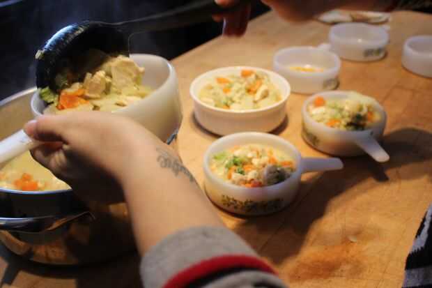 Cosas que necesitaráTarta de Pillsbury (2pk)Pechugas de polloLeche de coco LiteCaldo de polloPasta de Chile rojo tailandésZanahoriasDorar la cebollaAjoCilantroDe jengibre frescoAlmidón de maízClara de huevoEspecias (comino, sal, pimienta negra, jengi