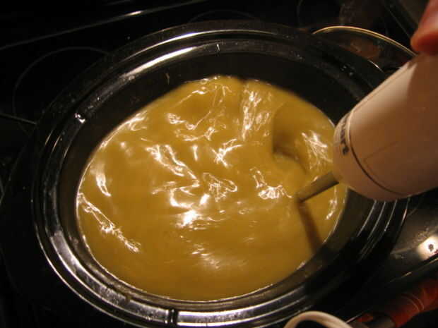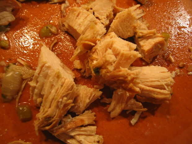 Cuando esté casi listo para comer, sacar el pollo de la olla y cortarlo en pedazos mordedura-clasificados. Me gusta darle una mezcla rápida con mi batidora antes de añadir el pollo de nuevo en, pero que es opcional.