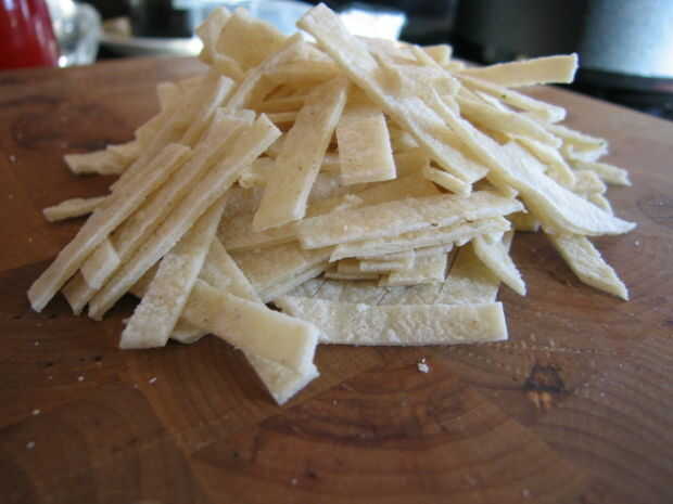 Para una gran guarnición, Esparza las 4 tortillas restantes (cortadas en tiras) en una hoja de galleta. Rocía las tiras con aceite y espolvorear con sal y pimienta. Darles una sacudida rápida que cubra todo y pop en el horno durante unos 10 minutos a 350, o hasta que estén marrones.