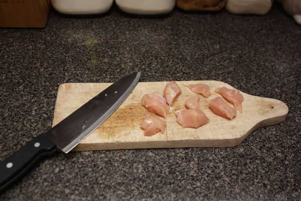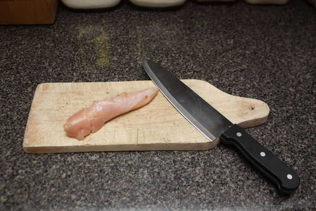 En una tabla de cortar, dados el solomillo de pollo en trozos de aproximadamente una pulgada de espesor cada uno.