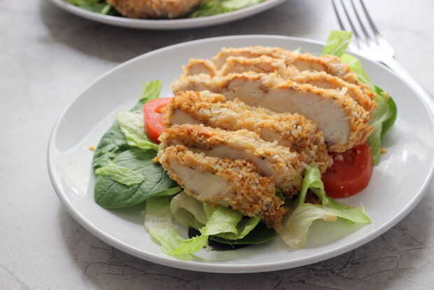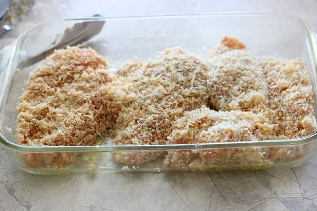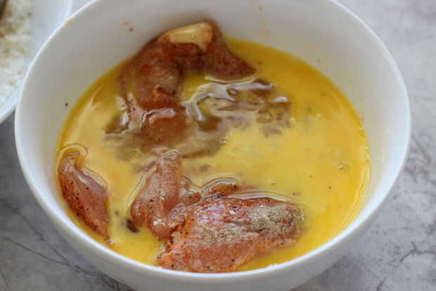 Sazonar el pollo por ambos lados con sal y especias (el pollo debe ser temporada a tu gusto). Engrasar una fuente para horno grande con aceite. Sumergir un pollo en un momento en el huevo, el rodillo en la mezcla de coco y en hornear.