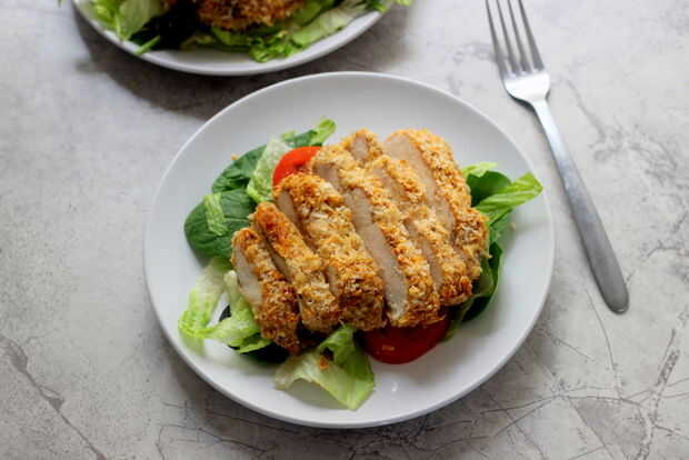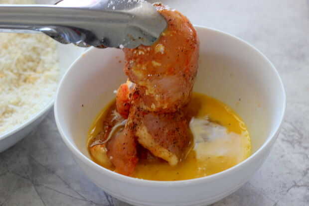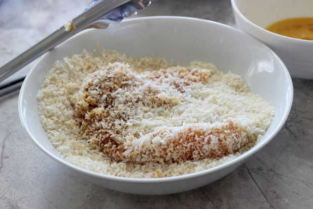 Instrucciones de la receta: Precalienta el horno a 350 grados. En un tazón mediano agregue coco y pan rallado y mezclar. Batir los huevos en un plato aparte y reservar.