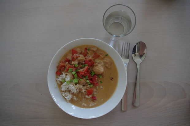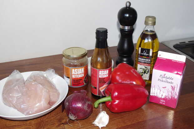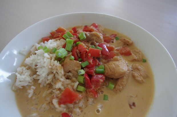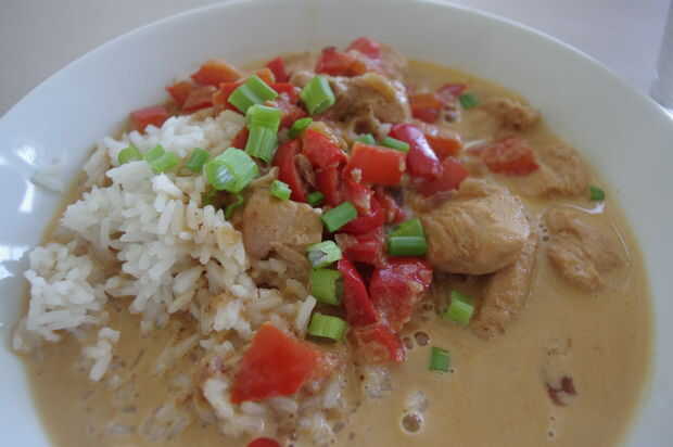 El plato está hecho de pollo y pimientos rojos, cocidos en una salsa de chutney de mango, crema y salsa de soja: lo que es un plato cremoso de dulce y sal. Es muy sabroso y perfecto para servir con arroz.