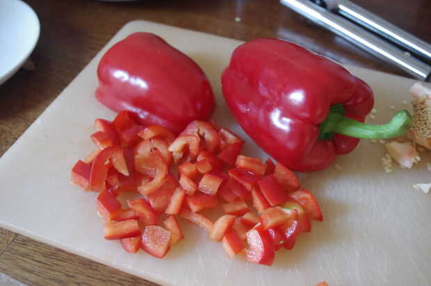 parmesano-Rancho Pizza de pollo con pimientos rojos asados (Feeds 4-6)Ingredientes:1 taza de agua 105deg.harina leudante de 2 1/2 taza1 paquete rápido-se levanta la levadura1 cucharada de polvo de hornear1 cucharada de azúcar una cucharacuchara 4 cuc