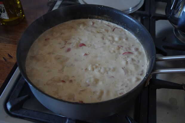 Para que sea una salsa, añadir crema y agua a la sartén profunda. He añadido unos 1 vaso de agua y 3 - 4 dl de nata, pero se debe añadir la cantidad apropiada a su comida: algunas cremas son más grasas que otras y gustos de los pueblos son diferentes, tan sólo añadir lo que se siente es apropiados.