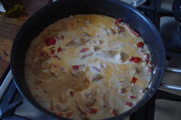 Cuando esté satisfecho con el sabor de la comida que cocine a fuego lento durante algún tiempo. Mina a fuego lento durante unos 30 minutos en este punto, pero no dude en tomar un tiempo más largo. Los gustos que se hunden en el pimiento y el pollo y hacerlas suaves y sabrosos.