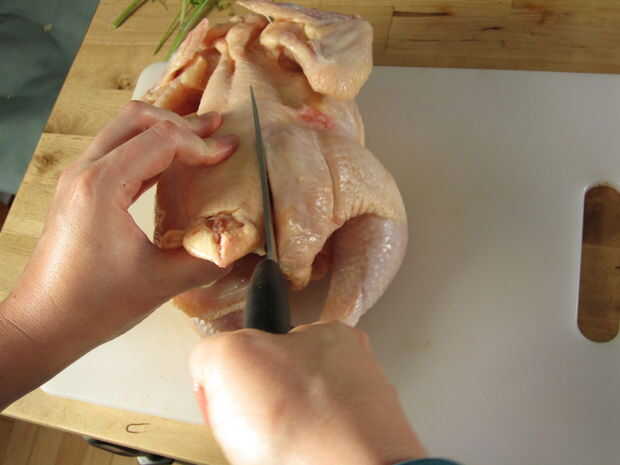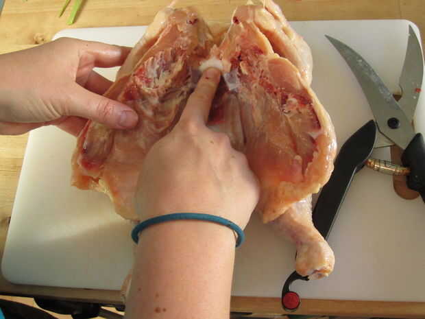 A continuación, encontrar el esternón - es el gran punto blanco en la sección central superior del pájaro. Usando el cuchillo de chef, cortar el esternón hacia abajo de la media. Esto permitirá que el pájaro a la posición totalmente plana de la barbacoa.