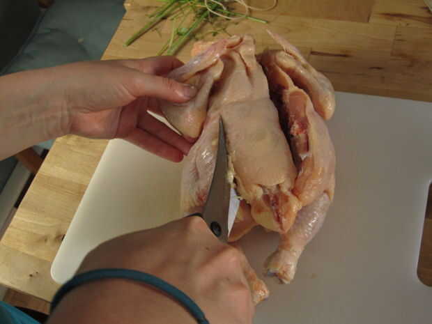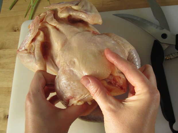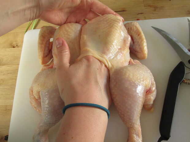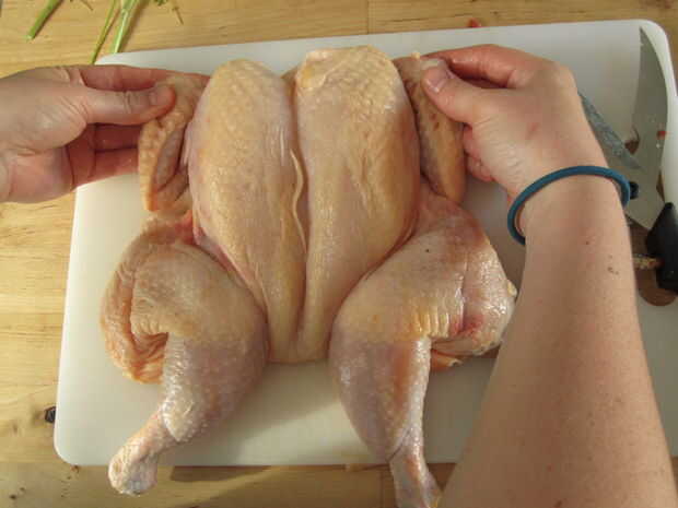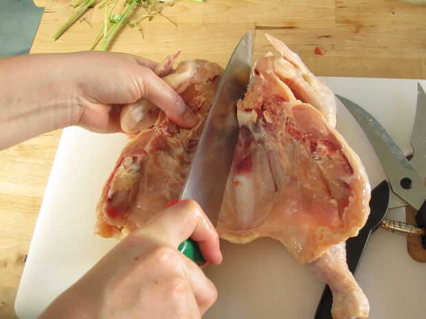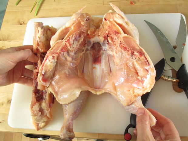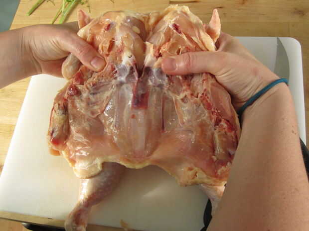 Una vez hecho esto que correctamente debe ser capaz de eliminar completamente la columna vertebral y abrir el pollo como un libro.