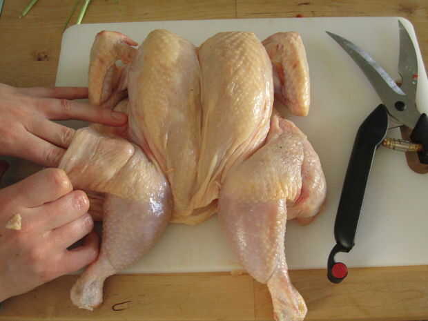 Voltee el pájaro aplanado y meter las puntas de las alas debajo del pecho, como si el pollo se dobla sus brazos bajo su cabeza mientras se broncea en la playa. Esto evitará las alas cocinando demasiado rápido y las puntas ardiendo.
