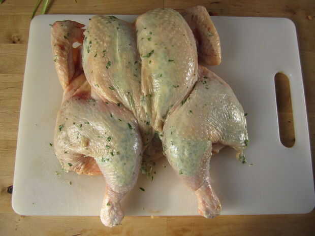 Difundir cualquier mantequilla queda en los dedos del pollo entero. Ahora tu pájaro está listo para la barbacoa.