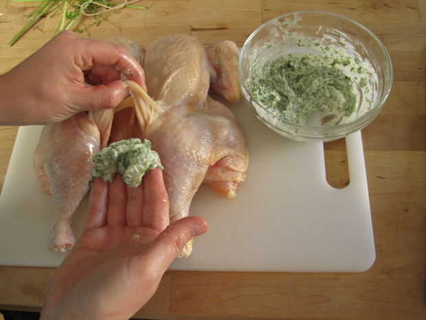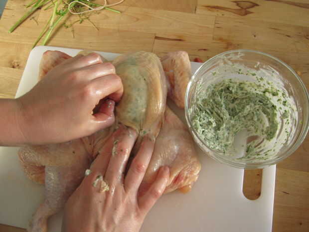 Con los dedos, tomar una porción de mantequilla con hierbas y presione debajo de la piel de la pechuga de pollo. Asegúrese de trabajar en todos los rincones - el más cuidado que pones en este paso, los más extendido que los sabores será. Repita con el segundo pecho y piernas, asegurándose de utilizar toda la mantequilla.