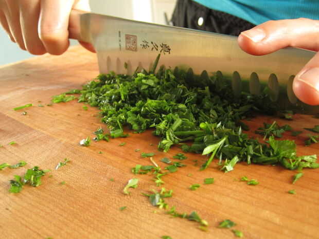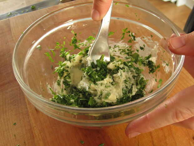 Finalmente picar las hierbas y mezclar en la mantequilla. Después de todo, ¿qué mejor para condimentar un asado de pollo que un montón de mantequilla? MMmmmm...