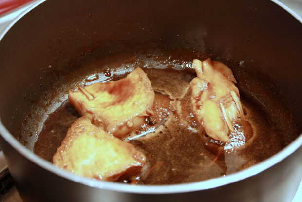 Una vez que ha cocido el pollo, añadir la marinada que queda en el recipiente y cubrir la sartén para que todo lo puede de vapor. Dejarlo durante unos 10 minutos a fuego lento la salsa burbujas pero no se quema. Después de 10 minutos sacar la tapa y dejar que la salsa espese. Continuará espesar una vez que se fuera de la sartén para que no lo deje conseguir demasiado grueso u oscuro. Por favor asegúrese de que el pollo está cocido todo el camino - si el pollo necesita un poco más tiempo para cocinar, echar un chorrito de agua para mantener la salsa de la quema. Nada es peor luego una salsa quemada y en las aves de corral hecho!