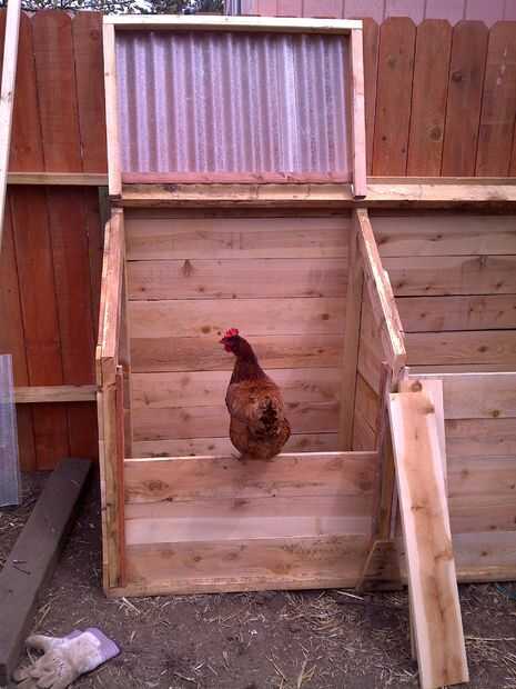 Nuestro compostador está construida con la madera (no tratada) más barata que pudo encontrar y está diseñado con pollos en mente: si tratan de salto para arriba en el techo inclinado y saltar la valla, fallará divertida. Los paneles frontales son desmontables para permitir el acceso fácil del bicho, y las tapas (cubiertas?) permanecen abiertas para la fácil intervención humana.