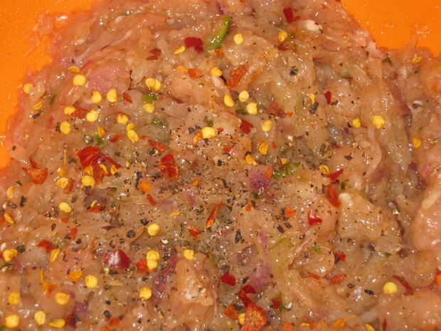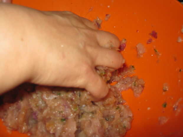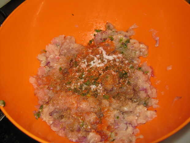 Añadir todos los ingredientes en el pollo picado. hacer bolas con las manos ligeramente húmedas y dejar de lado...