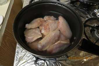 Poner 10 piezas de ala de pollo en la cacerola y llene con agua fría hasta que todas las alitas de pollo son bajo el agua. Poner la sartén en el fuego y encender el fuego en el nivel medio y deje que se sientan hasta que hierva durante 5 minutos