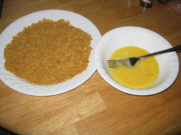 La primera cosa a hacer es aplastar a los copos de maíz. Para hacer esto, me tome una bolsa resellable sandwich y relleno con copos de maíz. Luego, tomar algo duro y cilíndrico, como un perno de balanceo, una lata de aerosol de aceite, una lata de judías - está en su gabinete y triturar todo en la bolsa. Vierte esto en un plato.