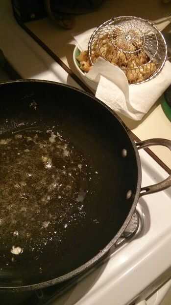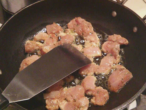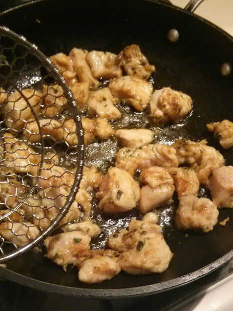 Desea dorar el pollo mientras que teniendo cuidado de no cocinar completamente. Retirar y escurrir el pollo en una toalla de papel, diario, pañal limpio o bolsa de papel.