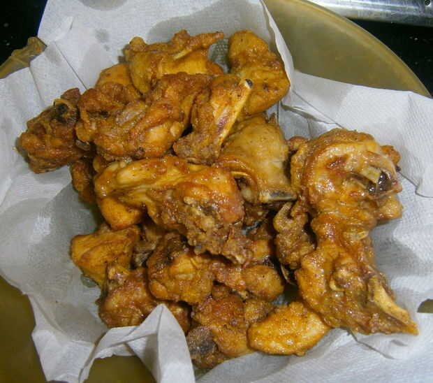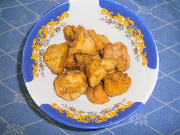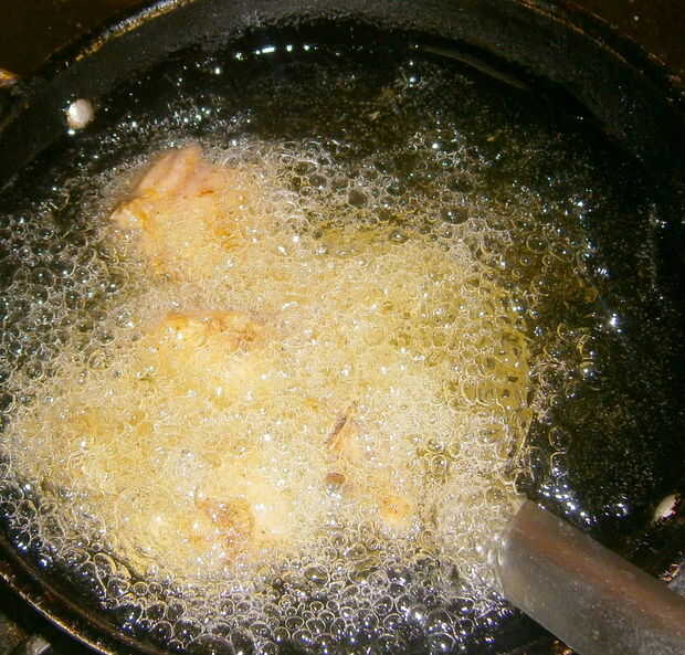Luego, freír bien los trozos de pollo marinado.