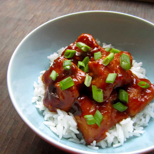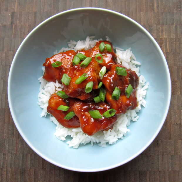 Yo soy también no para freír, así que la receta de pollo de este General Tso implica un poco de pan freír y algunas claras de huevo y almidón de maíz para obtener una cubierta externa crujiente. : D