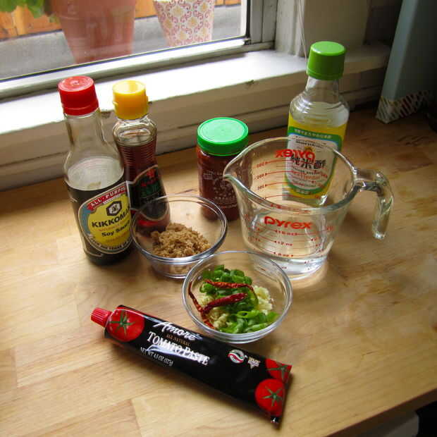 Ahora añadiremos el resto de los ingredientes. Me gusta agregar primero el agua para no queman el jengibre y el ajo. Luego agregar el aceite de sésamo, salsa de soja, pasta de tomate, vinagre de vino de arroz, pasta de ají/ajo y el azúcar moreno. Esto mezclar muy bien y llevar a hervir.